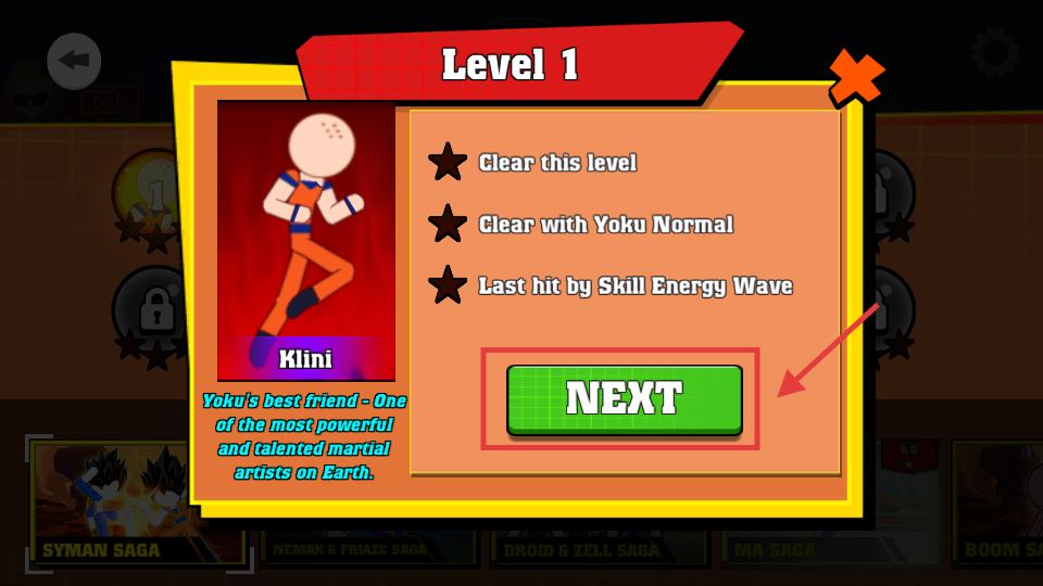 1、点击NEXT开启Level1,需完成通关、YokuNormal通关、技能终结三目标以拿满星。