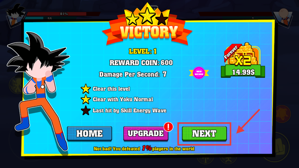 4、通关后点击NEXT进入下一关,获取600金币等奖励,用于角色升级或解锁内容。