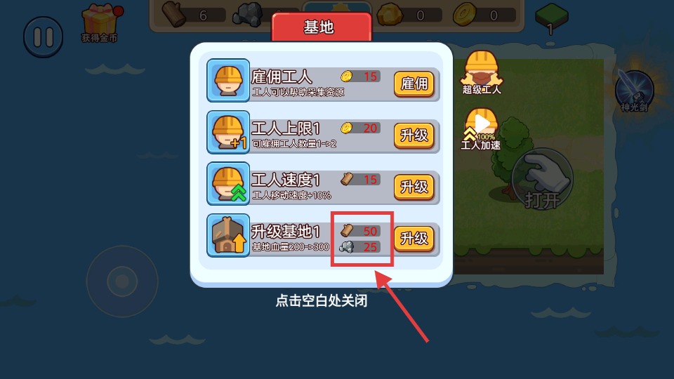 2、升级基地1需木材50和石头25,收集足够资源后点击升级,提升基地血量保障生存。