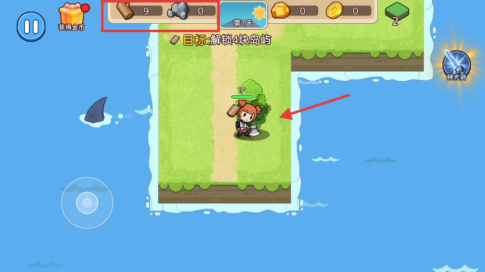 3、操控角色砍树收集木材,积累资源以解锁4块岛屿,按目标推进生存进程。