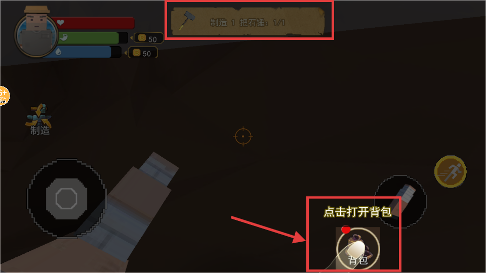 1、点击【背包】打开,查看制造【石锤】进度,管理【背包】内物品,为后续操作做准备。