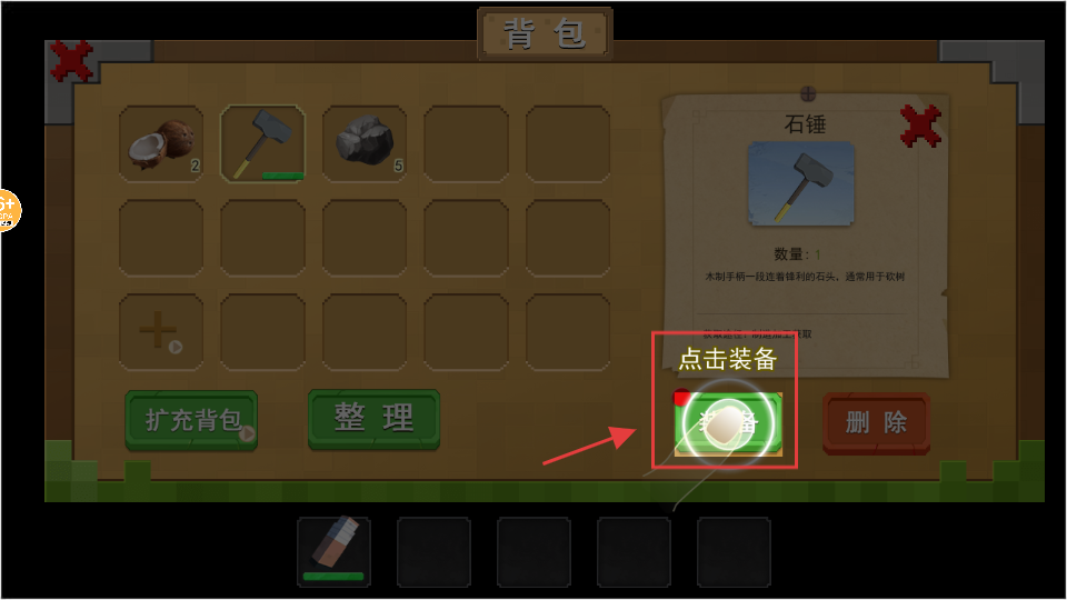 2、在【背包】点击【装备】,将【石锤】装备,装备后可用【石锤】砍树获取资源。