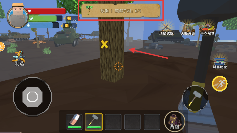 3、用装备的【石锤】砍【椰子树】,完成砍1颗【椰子树】任务,获取木材资源。