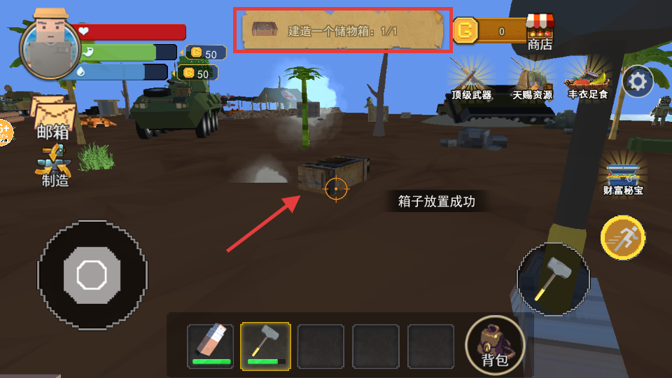 4、按任务提示建造【储物箱】,放置成功后可存储海岛生存收集的各类资源。