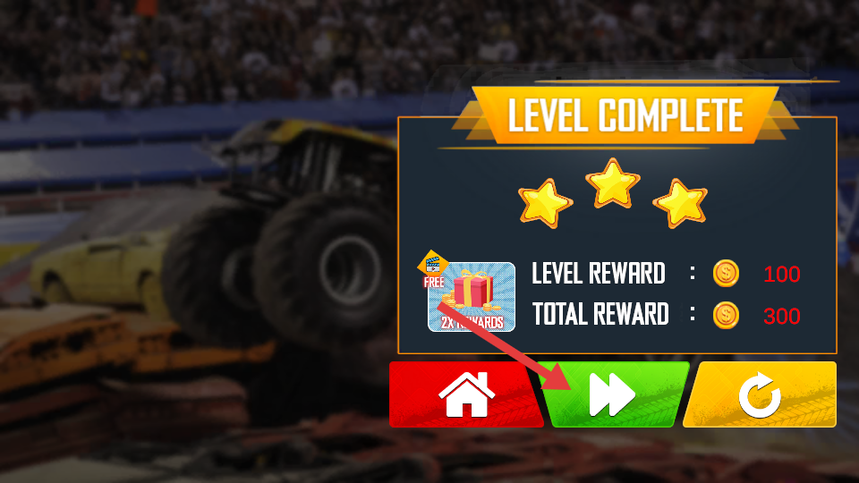 4、关卡完成后领取奖励,点击绿色箭头按钮,继续挑战。