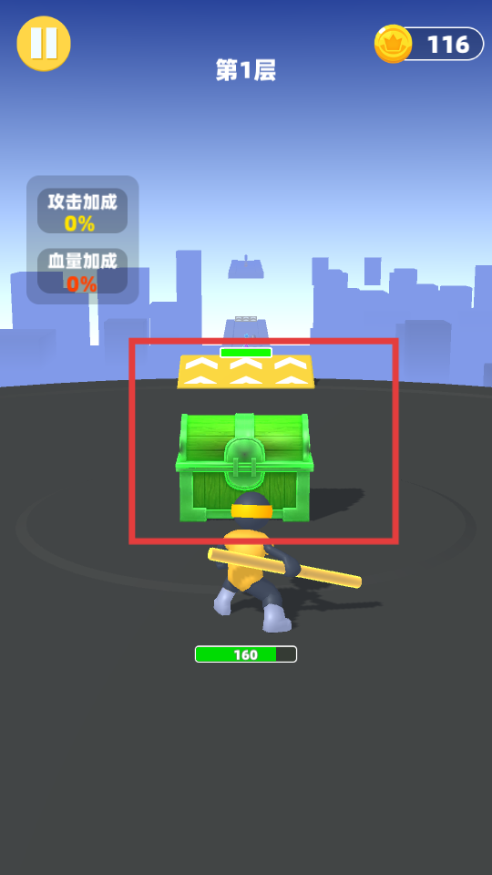 4、击败敌人后,向箭头方向前进,看到红框内的绿色宝箱,靠近获取金币等奖励,助力后续闯关。