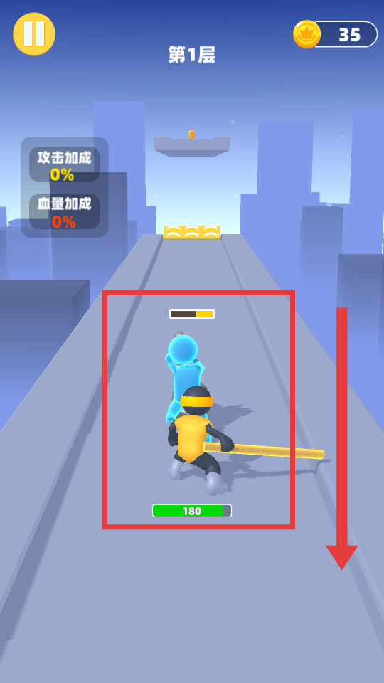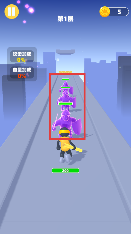 2、进入第1层游戏场景后,遇到红框内的紫色敌人,【点击屏幕任意位置】进行对敌人进行攻击。
