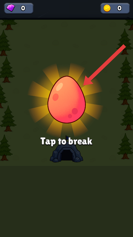 1、游戏初始界面,看到发光的【蛋】,连续点击指标所指的蛋,孵化出恐龙。