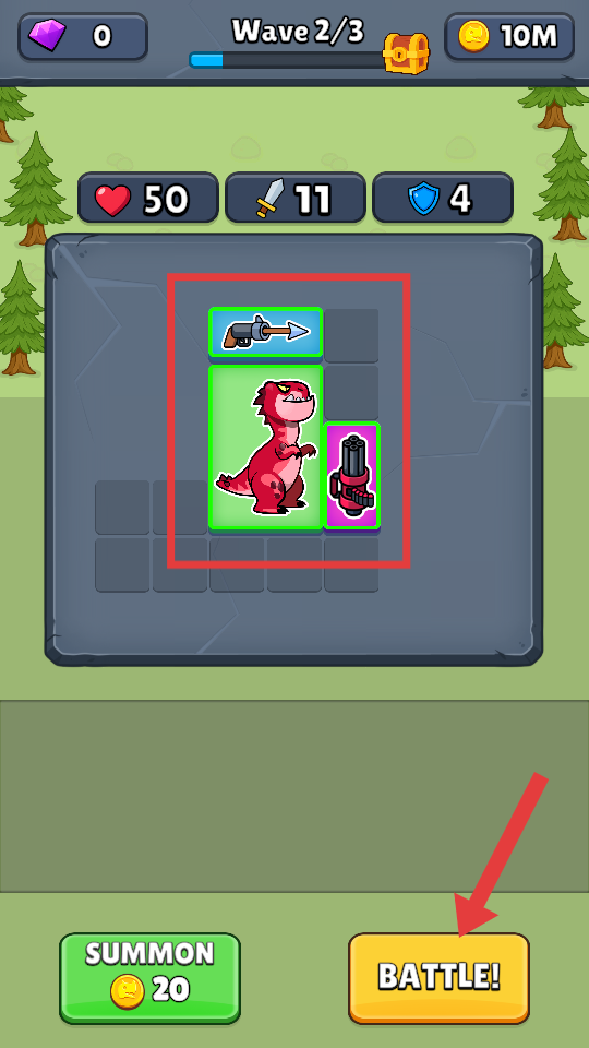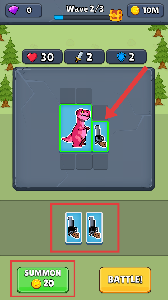 2、进入关卡界面,利用【无限金币】,点击【SUMMON-20】绿色按钮召唤武器卡牌,相同卡牌放置在一起可进行升级。