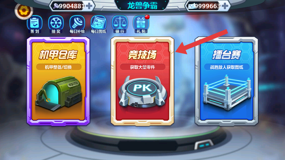 1、在游戏主界面,可利用无限金币和钻石解锁机甲、参与抽奖等,提升战力,然后点击【竞技场】进入战斗场景。