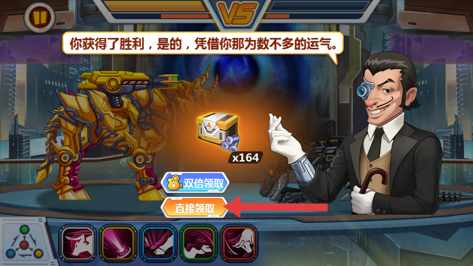 4、战斗胜利后,在结算界面点击【直接领取】按钮,获取零件等资源,用于升级机甲。