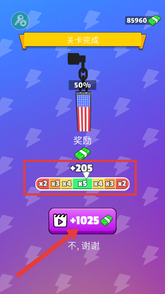 4、关卡完成后,观察方框内【指针】位置,当指针到达【X5】使,点击【+1025】免广告进行领取。