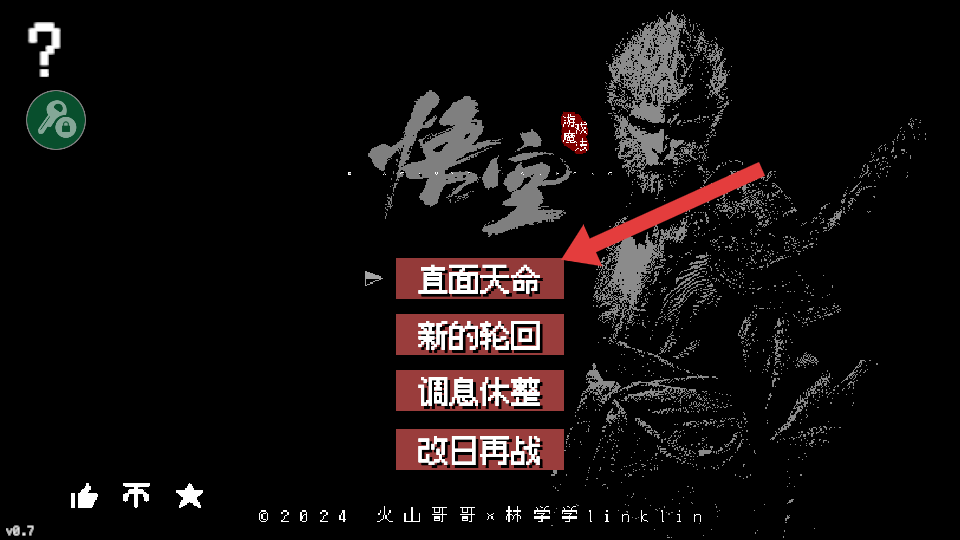 1、进入游戏后,选择【直面天命】开始挑战,开启像素风格的黑神话0.7版本冒险。