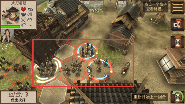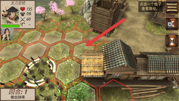 2、点击格子查看路径,规划【太刀足轻】等单位的移动路线,向目标区域推进。