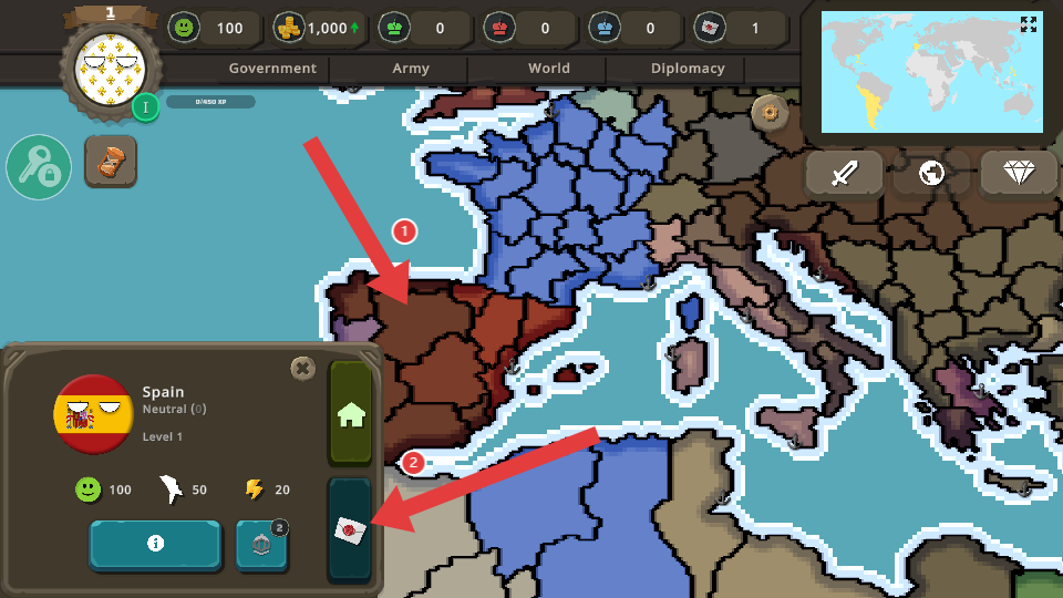 2、在世界地图上选择目标国家(如Spain),点击进入其信息界面,准备进行外交操作。
