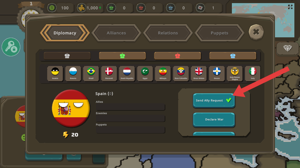 3、在外交界面,点击【Send-Ally-Request】按钮,向目标国家发送同盟请求。