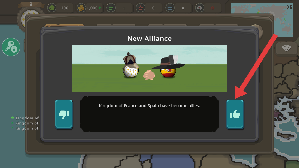 4、同盟请求成功后,点击点赞按钮确认,与目标国家结成同盟,共同发展势力。