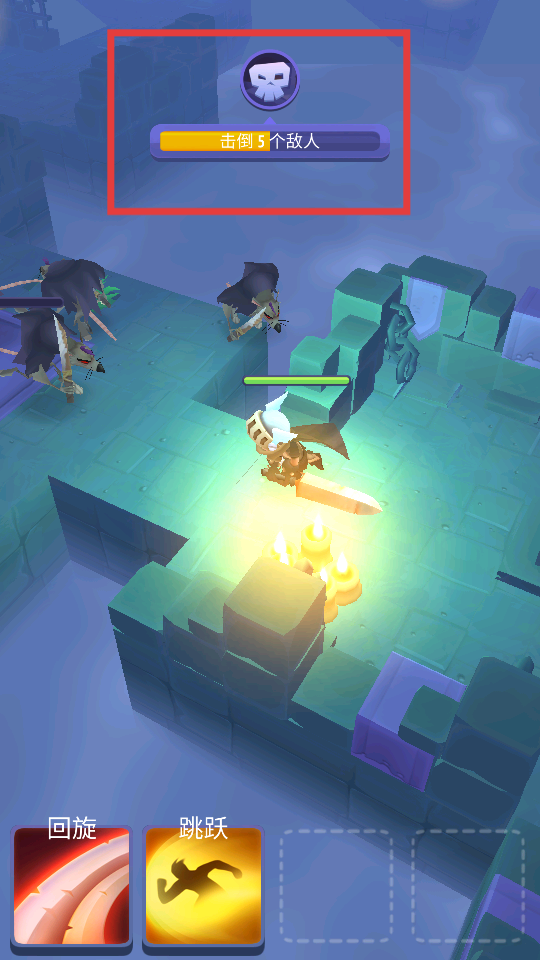 2、留意屏幕上方红框内的任务提示,如【击倒5个敌人】,明确当前关卡目标。