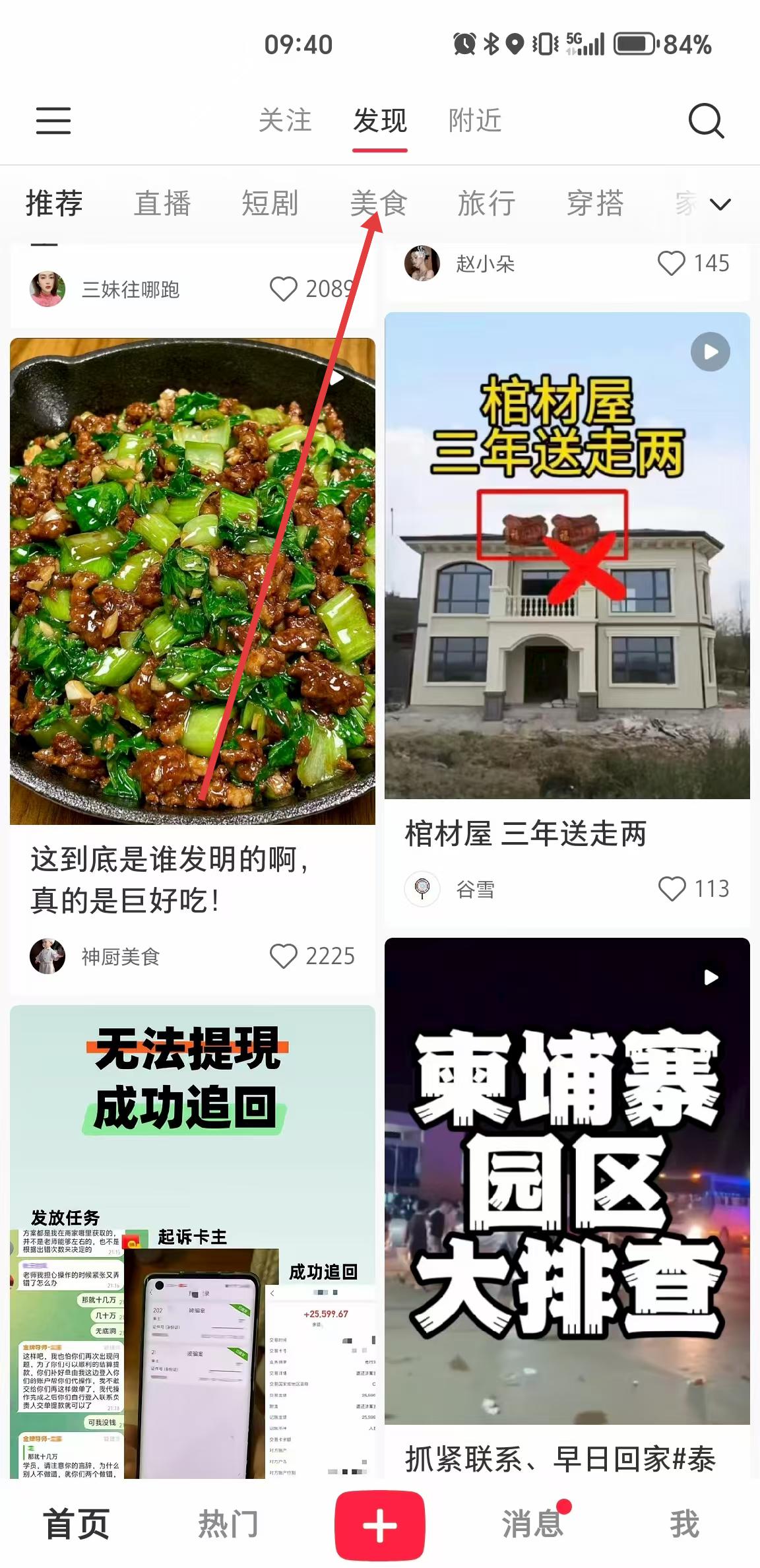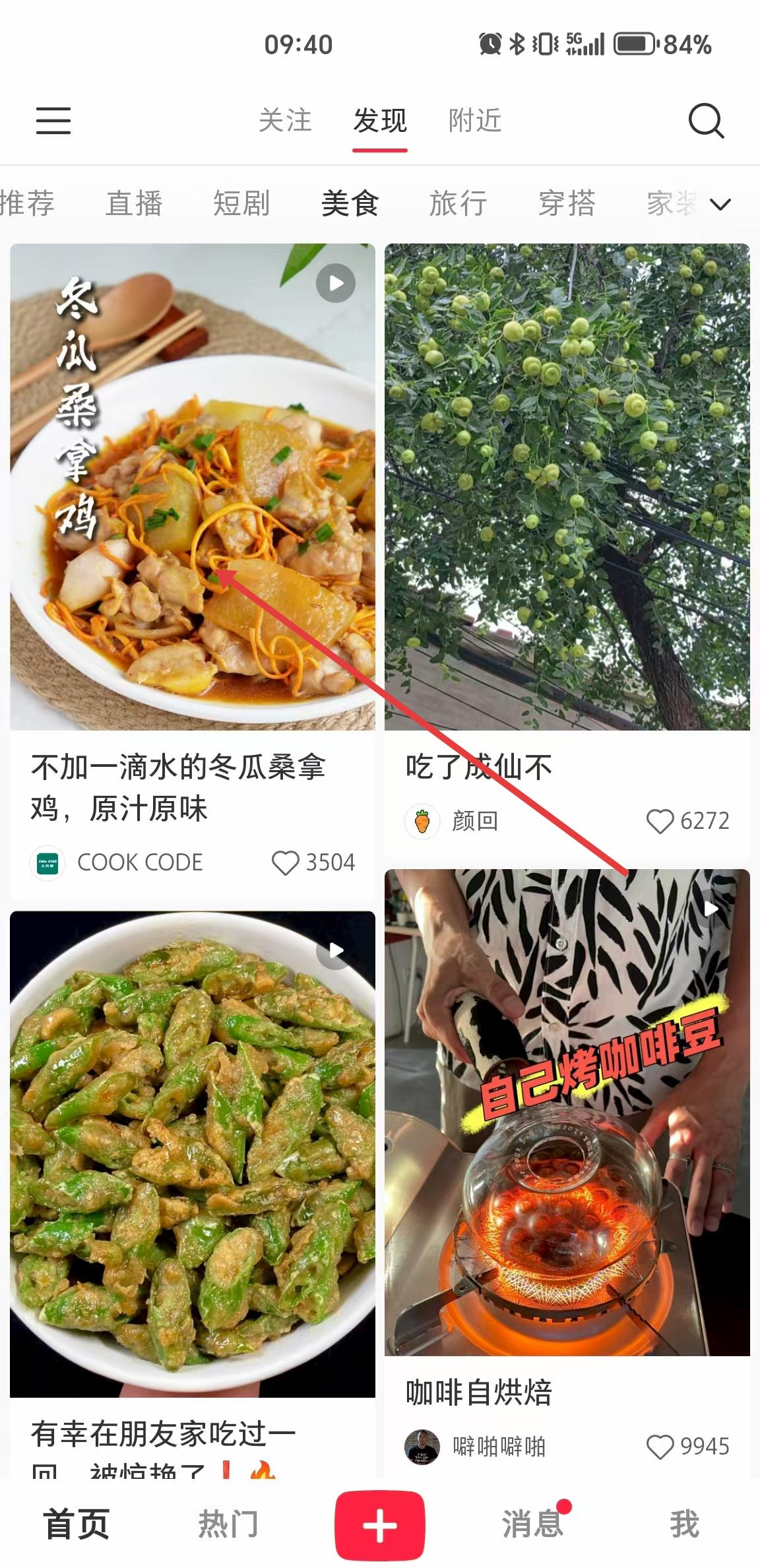 1、我们进入小红书【发现】页后,点击【美食】分类,就能看到各类美食内容推荐啦。