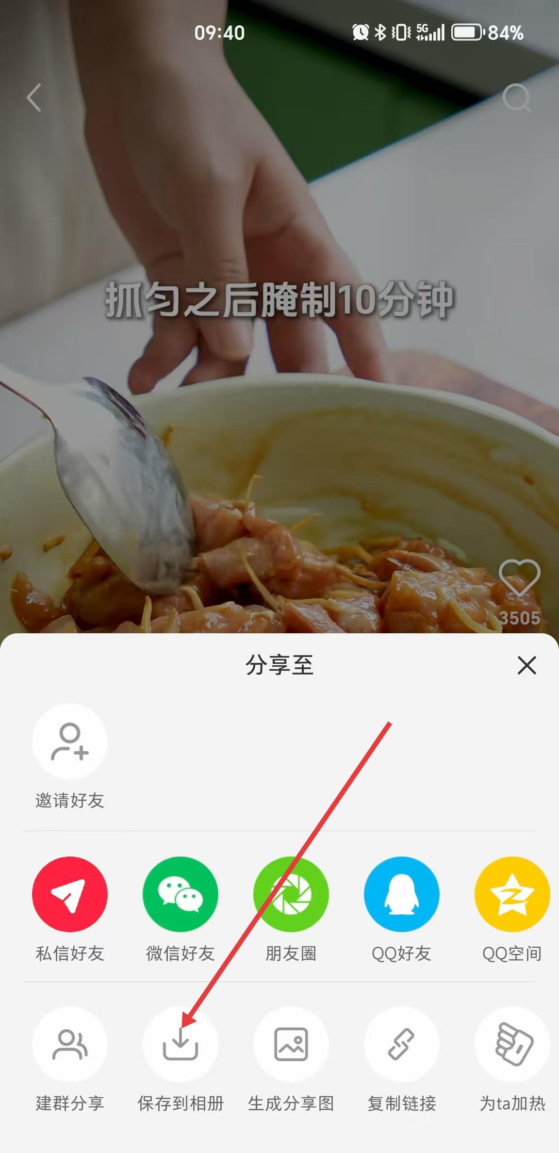 4、在弹出的分享选项中,点击【保存到相册】,这样美食视频就下载到手机里啦。