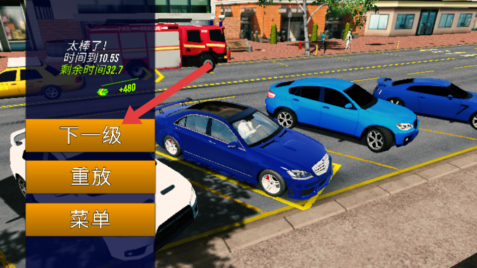 4、成功停车后,点击【下一级】,进入更高难度的停车挑战,不断提升停车技巧。