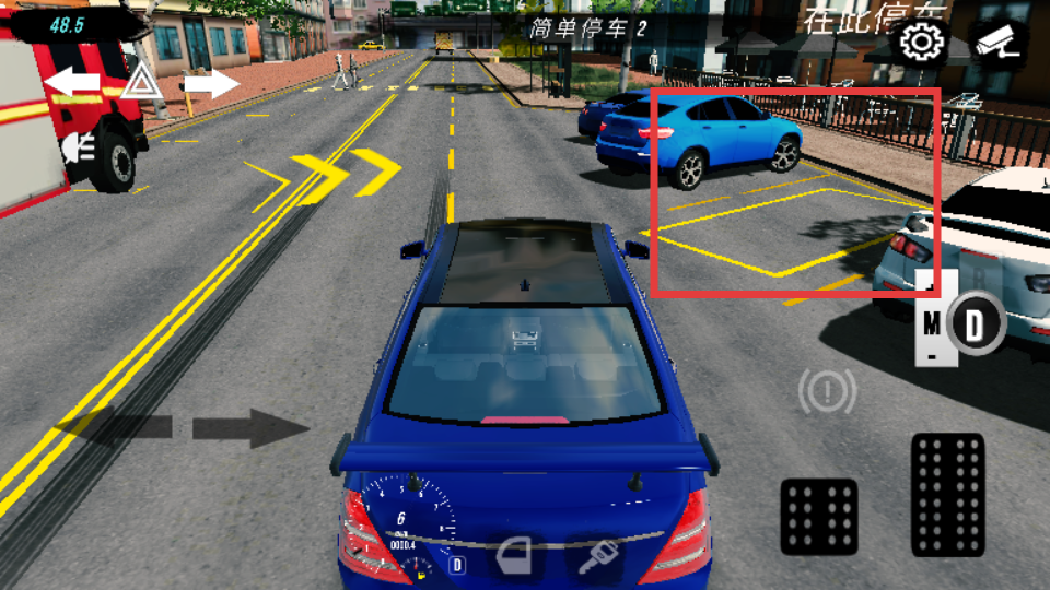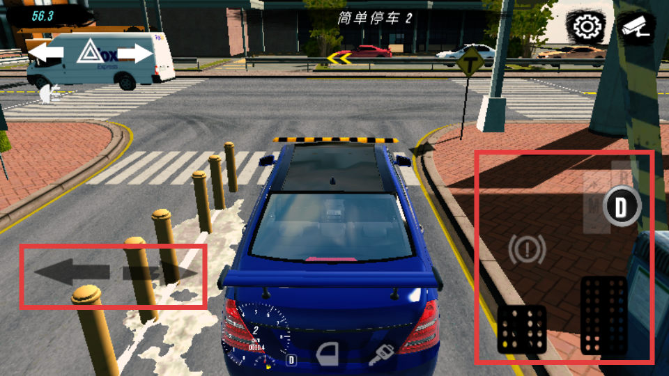 2、利用左侧方向按钮和右侧挡位、油门刹车按钮,操控车辆在道路上行驶,躲避障碍。