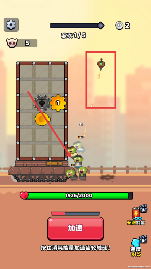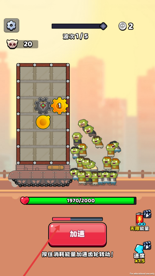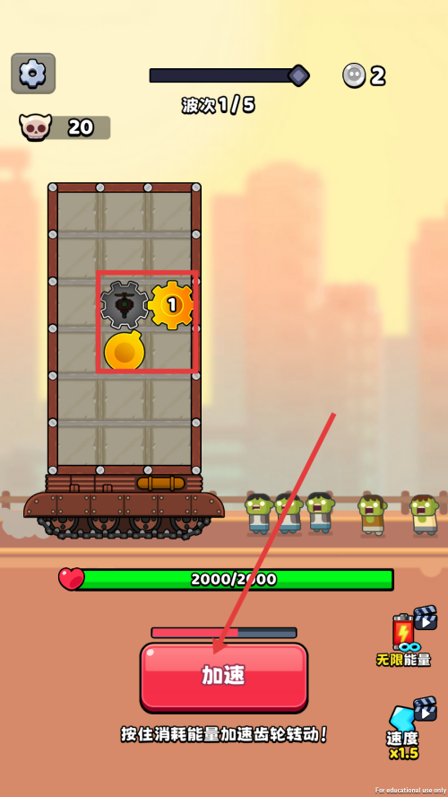 3、敌人靠近时,持续按住【加速】,利用齿轮转速,尽可能多消灭敌人,同时留意血量变化。