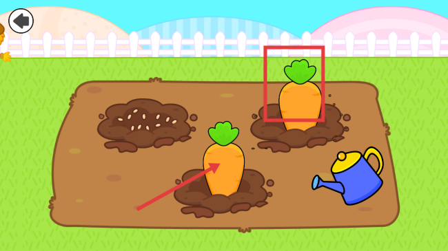 4、种子种下后,用浇水壶浇水,不久后种子发芽长成胡萝卜,完成农场种植的流程。