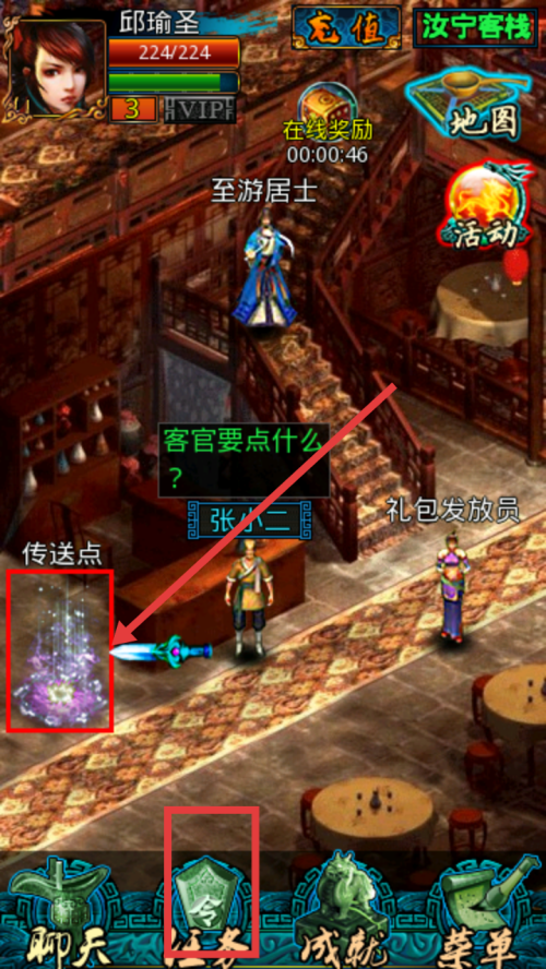 2、在汝宁客栈场景中,可通过传送点前往其他区域,也能点击【任务】按钮,查看并接取任务推进游戏。