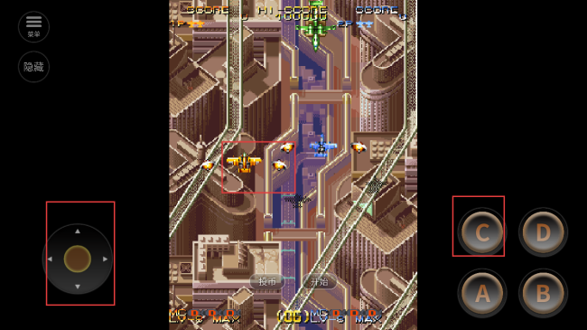 2、在城市场景中,通过左侧方向键操控战机移动,利用右侧【C】键等按键攻击敌人,躲避敌方火力。