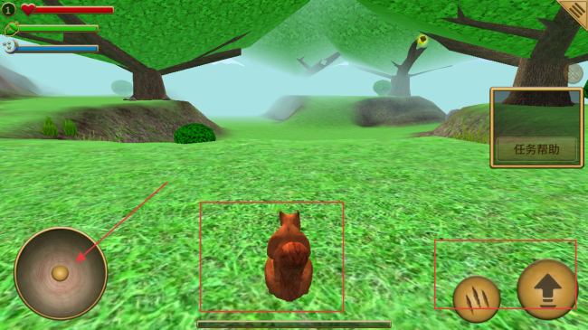2、进入游戏场景后,操控左侧虚拟摇杆移动松鼠,右侧按钮可进行攻击等操作,熟悉操作方式。