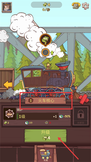 2、积累资源后,点击“升级”按钮,提升火车核心等级,增强火车性能同时增加钞票获取的数量。