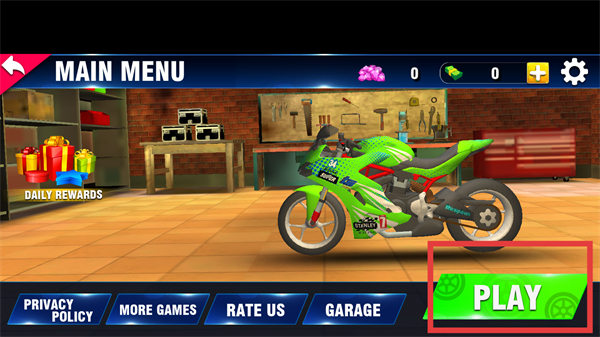 1、点击【PLAY】,进入摩托车竞速游戏,开启城市道路骑行挑战。