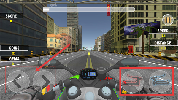 2、用左侧方向键调整行驶方向,右侧刹车、加速按钮控制车速,在道路上驰骋。