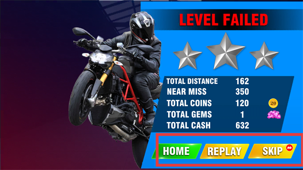 4、若关卡失败,可点击【HOME】返回主菜单、【REPLAY】重新挑战或【SKIP】跳过广告。