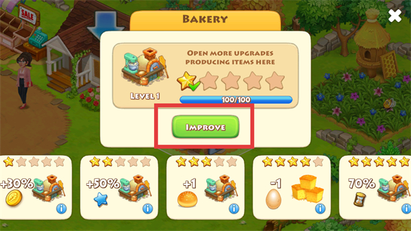 2、在面包房升级界面,点击【IMPROVE】按钮,提升面包房等级,解锁更多生产升级选项。