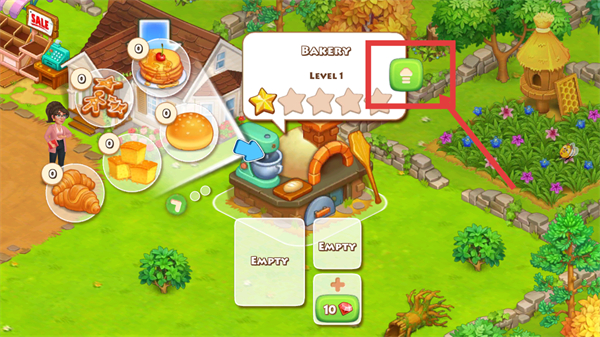 1、点击面包房旁的绿色图标,进入面包房详情界面,可查看等级与升级相关信息。