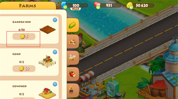4、在农场界面,点击菜园(GARDENBED)旁的【5】金币按钮,花费5金币解锁或升级菜园,增加种植位。