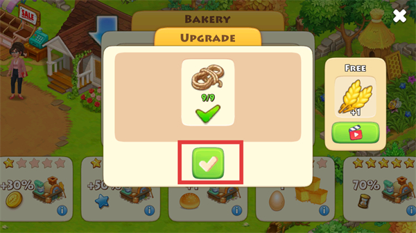 3、升级确认界面,点击绿色对勾按钮,完成面包房升级,获取【9/9】的升级道具。