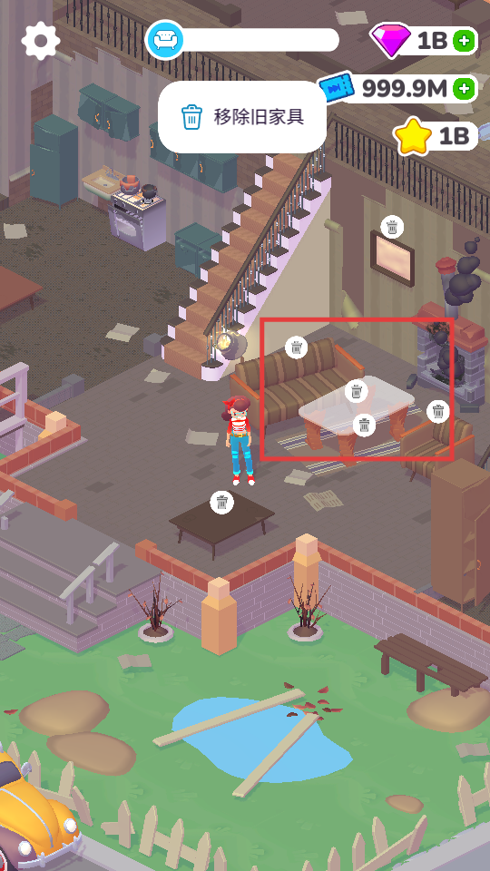 1、根据提示,移除场景中的旧家具,为后续布置腾出空间。