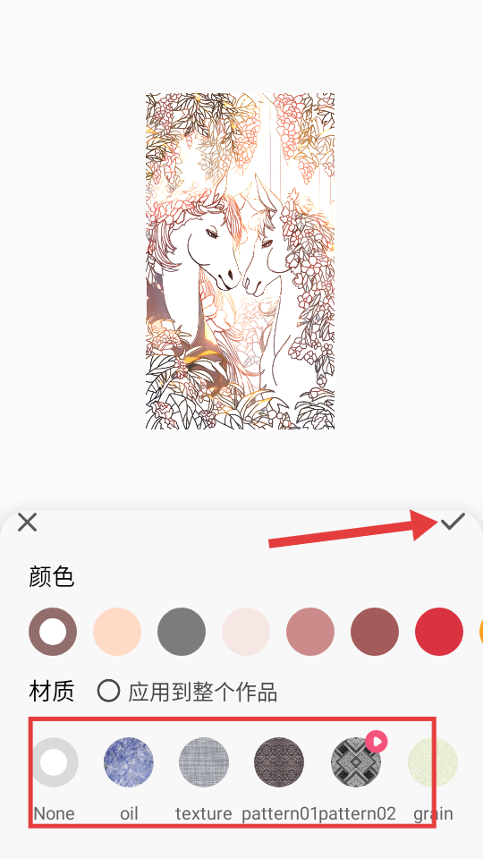 3、可选择颜色和材质,设置完成后点击对勾,应用到填色作品中。