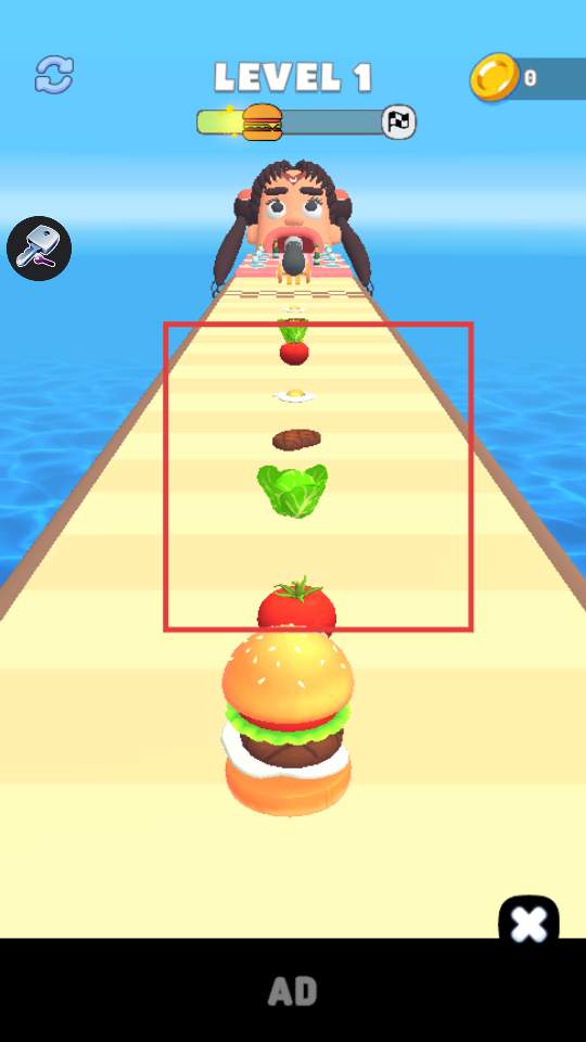2、移动汉堡,收集赛道上的番茄、生菜、肉饼等食材,组合成更完整的汉堡。
