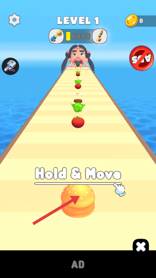 1、在关卡中,按照【Hold&Move】的提示,操控汉堡在赛道上移动,准备收集食材。