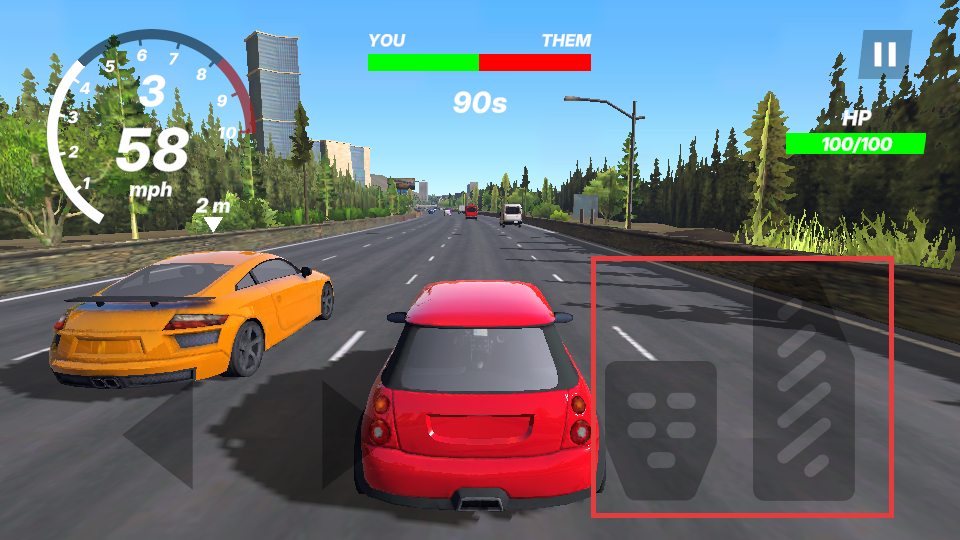 2、比赛时,点击右侧加速区域,提升红色车辆速度注意车速显示和HP值。