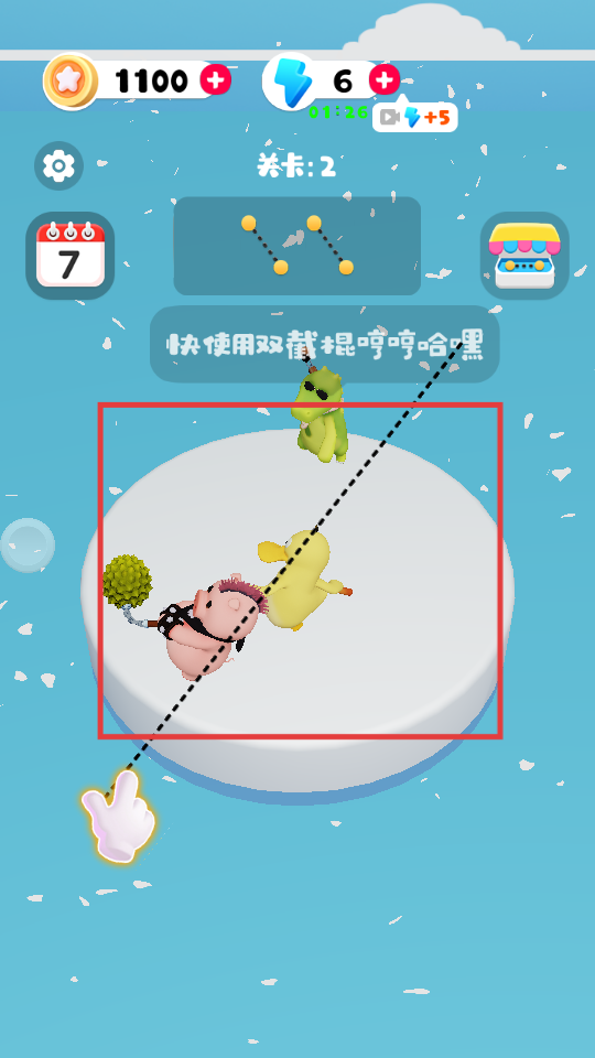 2、根据虚线提示,操作让圆形平台上的角色分开,推进拉架进程。