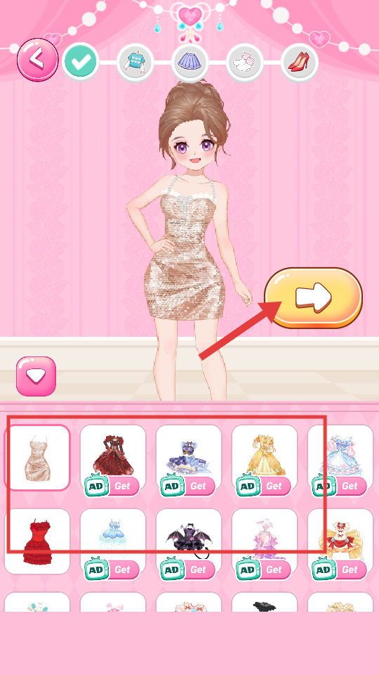 3、在服装选择区域挑选喜欢的服饰为角色穿戴,之后点击箭头按钮继续。