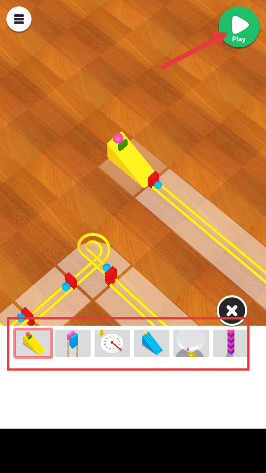 3、从下方选择轨道组件布置轨道,布置完成后点击【Play】按钮,启动弹珠运行。