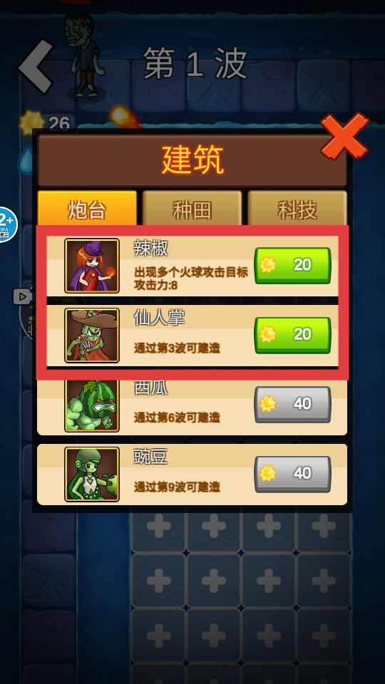 1、游戏开始进入第1波防御阶段,点击【建筑】里的【炮台】选项,消耗阳光优先建造如【辣椒】这类可立即使用的攻击建筑。