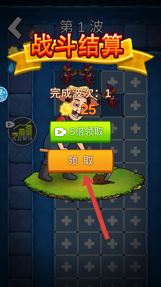 2、成功抵御第1波敌人后,在【战斗结算】界面,点击【领取】按钮,获取阳光等奖励资源。