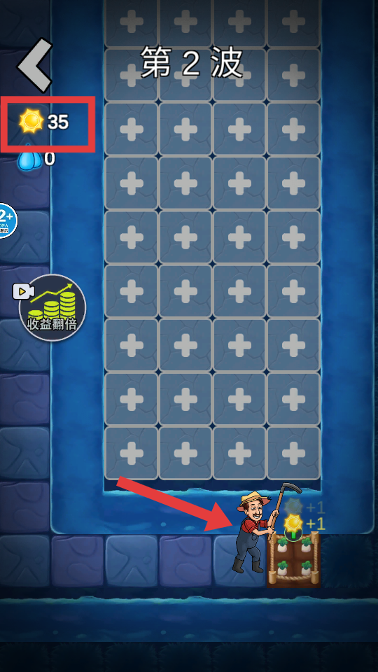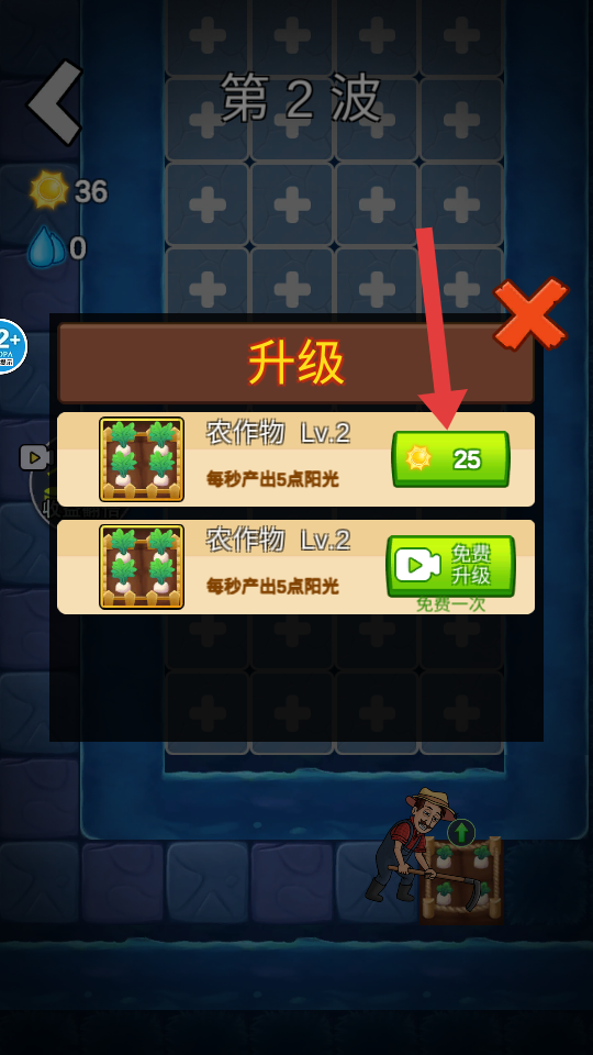 3、进入第2波防御前,留意左上角的【阳光数量】,点击农田建筑图标,进入升级界面。